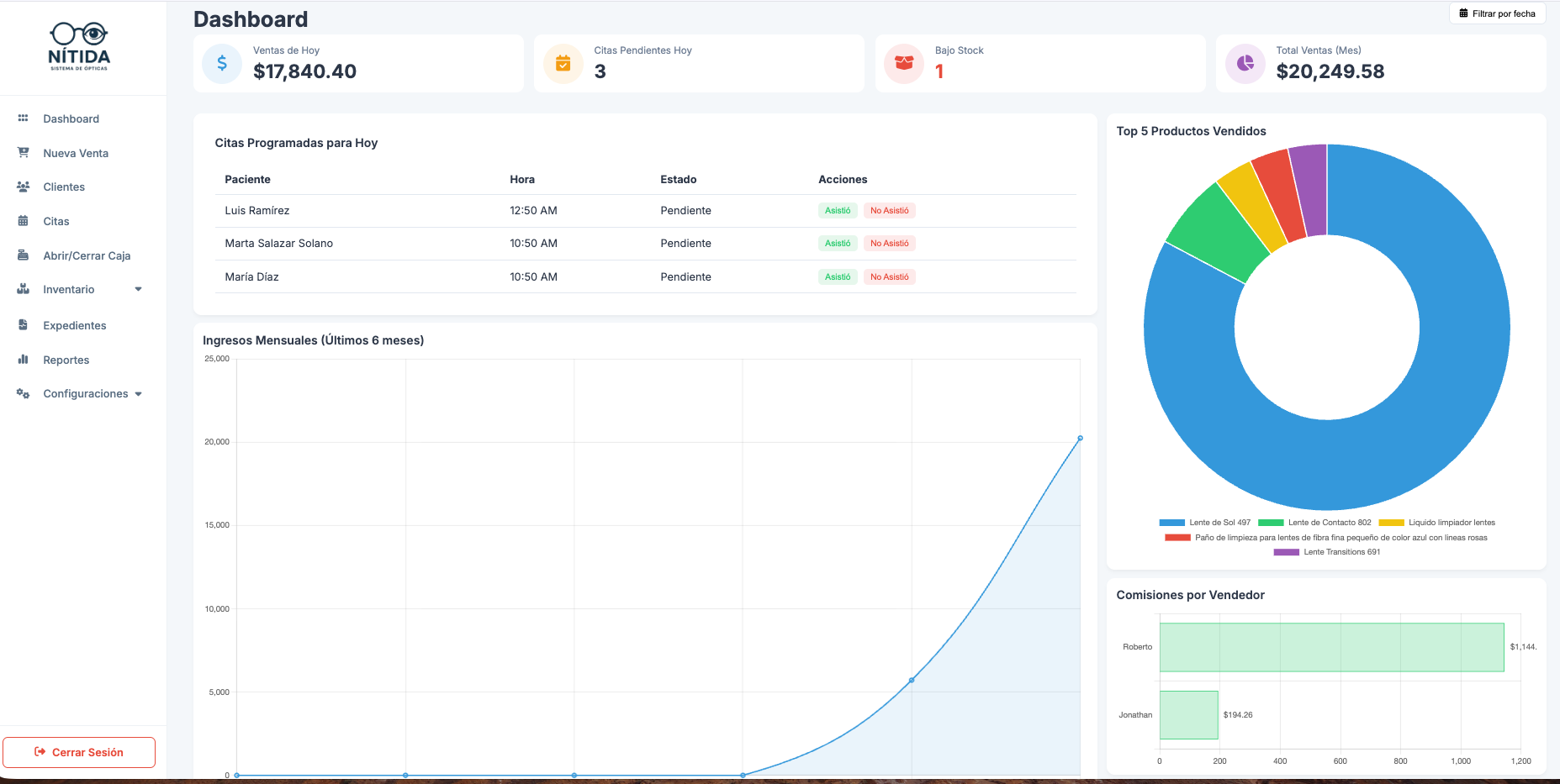 Gestiona tu óptica con un sistema integral que combina control exhaustivo de inventarios, administración de citas y seguimiento personalizado de clientes. Registra prescripciones y mantiene un historial ordenado para mejorar la atención. Su interfaz intuitiva acelera procesos, reduce errores y potencia la rentabilidad.